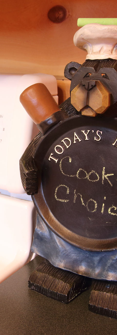 The kitchen with it's butcher block island is roomy and well appointed to handle any of your cooking needs. Bear themed dishes and cutlery make every meal special. Park style bbq grill.